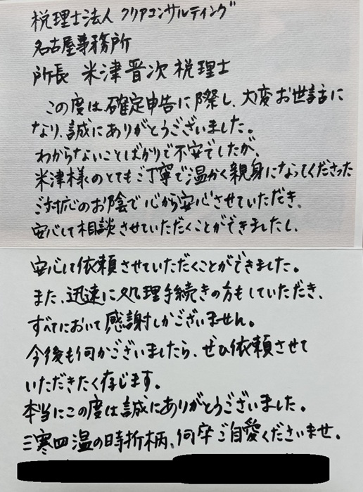 そんな中、確定申告の依頼を初めて受けたお客様から、確定申告のお礼の手紙をいただきました。
