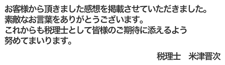 対応が非常に早く的確で丁寧なアドバイスをもらえるので本当に有難く感謝しています。 細かい相談や困ったことにもいやな態度ひとつせず、迅速にお答えしていただけるので、日々信頼度が上がっております。こんなことなら、もっと早く米津晋次税理士にお世話になっていれば・・・と、少し贅沢な悩みもあったりします。 今後ともどうぞよろしくお願い致します。 清水アセットマネジメント株式会社 代表取締役 清水昌史 様(名古屋市中区)